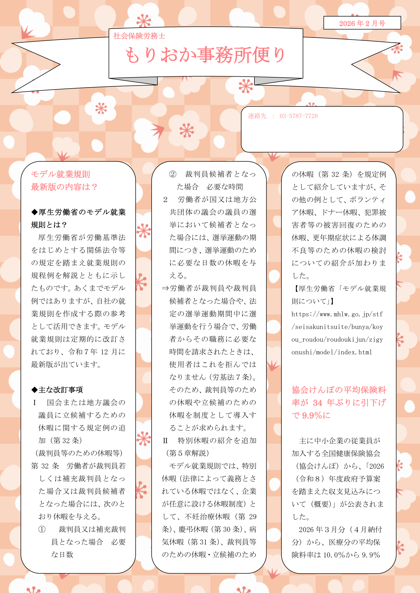 モデル就業規則や協会けんぽについて臨時で事務所だよりを発行いたします。ぜひご確認ください。