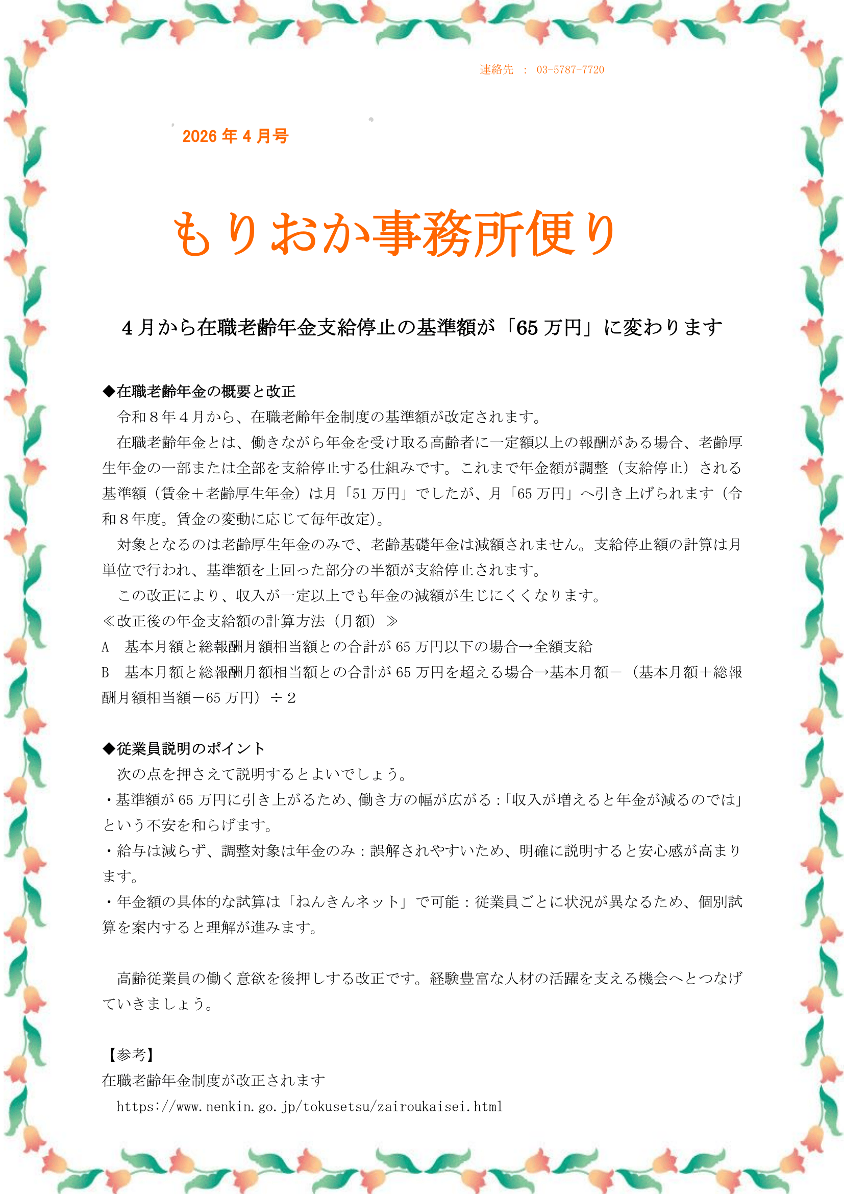 在職老齢年金支給停止について臨時で事務所だよりを発行いたします。ぜひご確認ください。